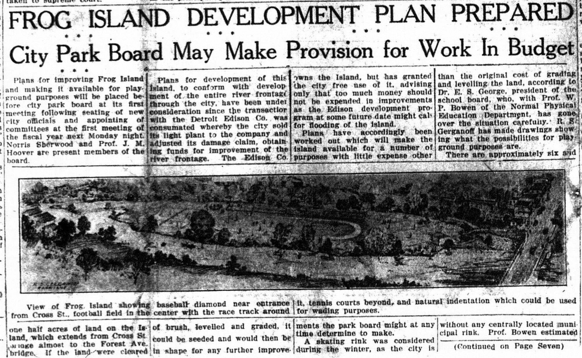 1937 Ypsilanti Press article on the plans for Frog Island.