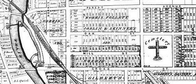 1900s Map showing Prospect Park as a cemetery and Frog Island as an island.