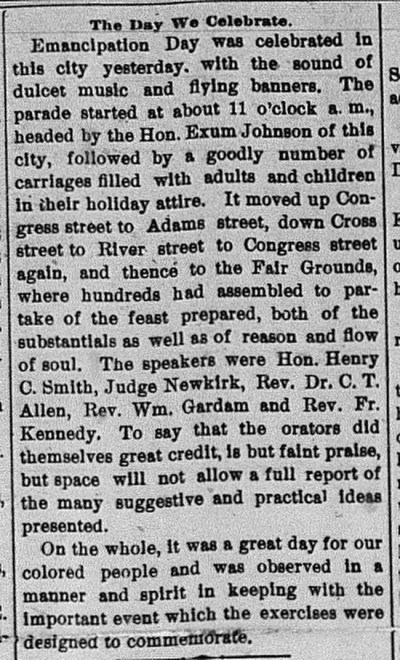 August 1900 Ypsilanti Commercial on Emancipation day Celebrations in the Ypsilanti Fair Grounds.